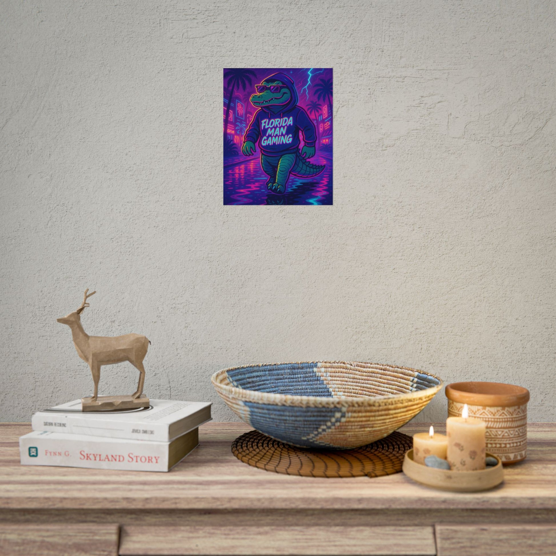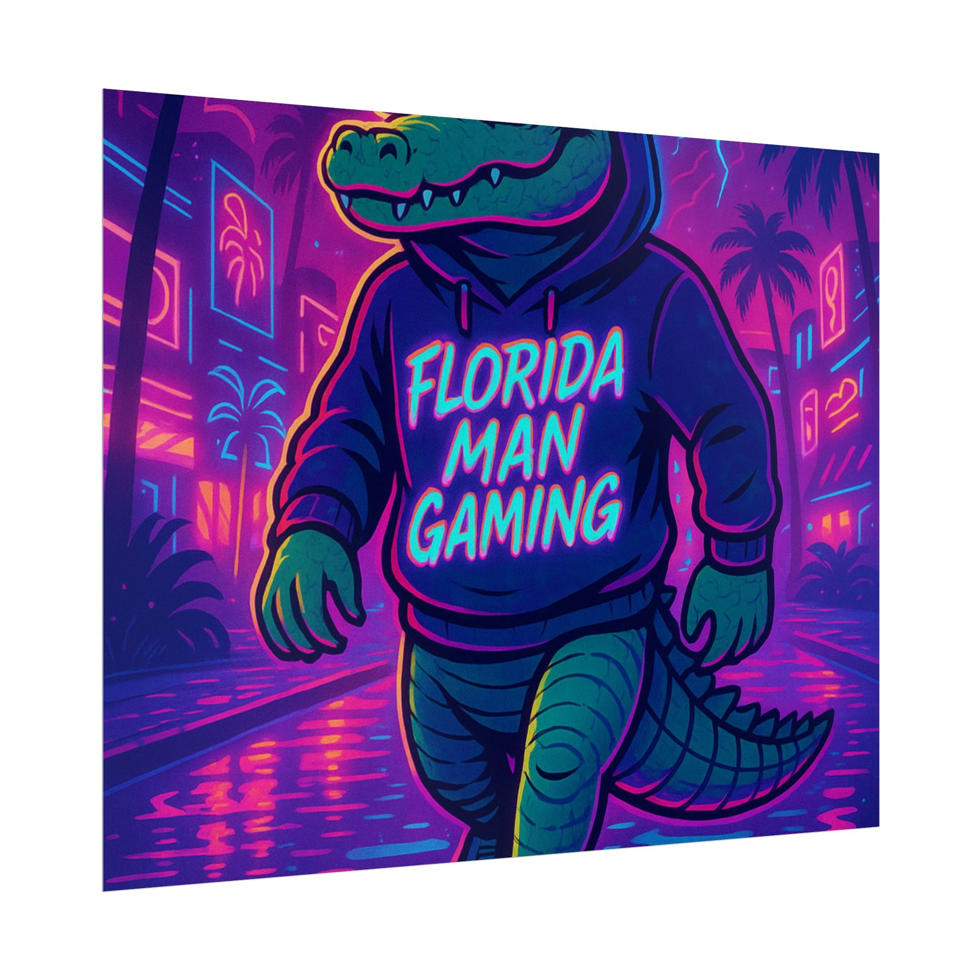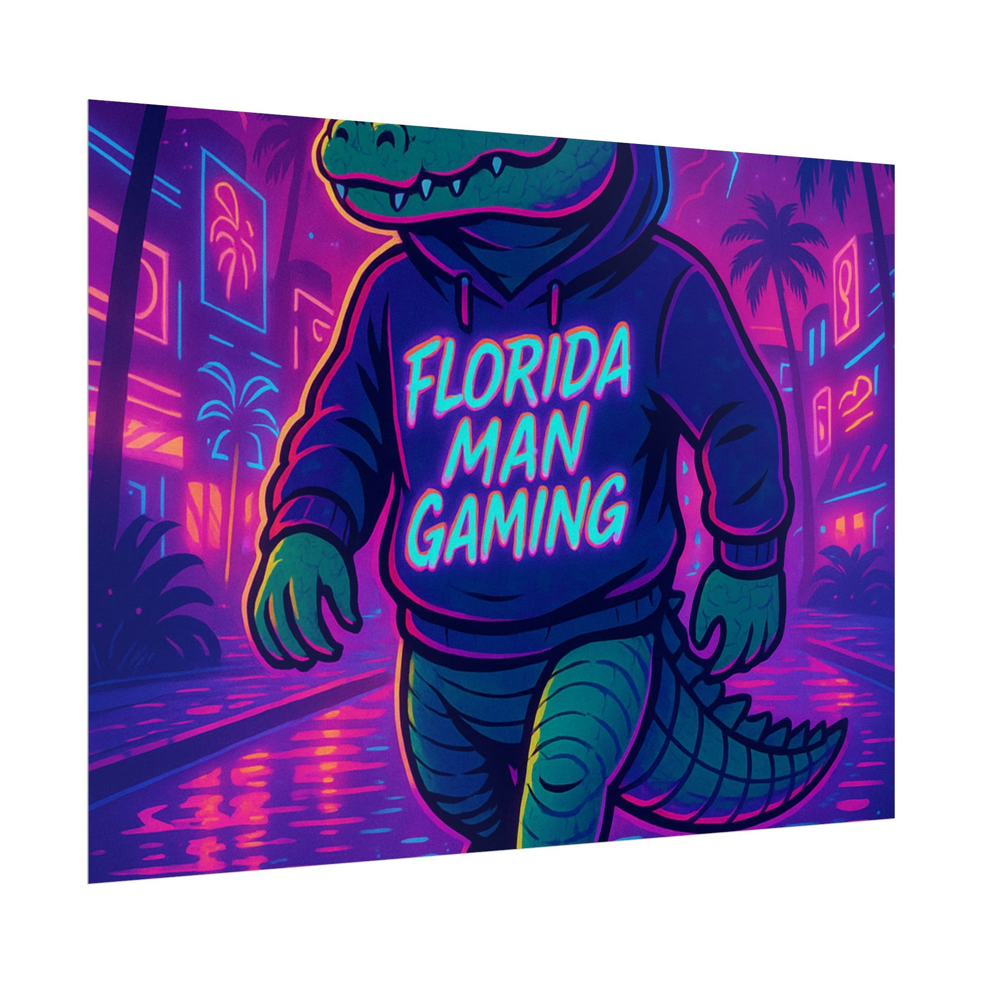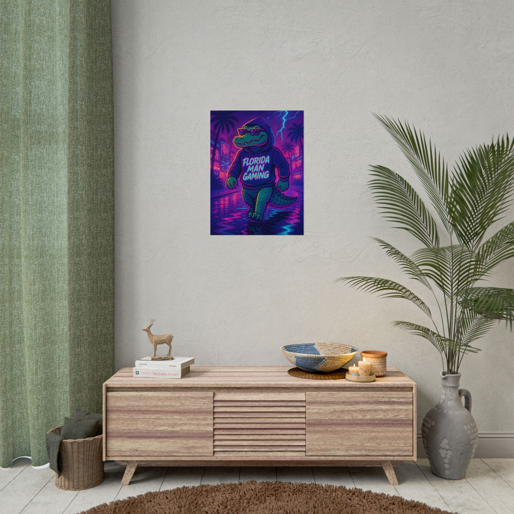 Step into a vibrant 80s dream with this retro vaporwave neon poster featuring the Florida Man Gaming gator mascot strutting down a rainy street at night. Perfect for gamers and fans of Florida culture, this poster is a colorful addition to any space. Celebrate gaming and Florida vibes with this electric and chaotic design.