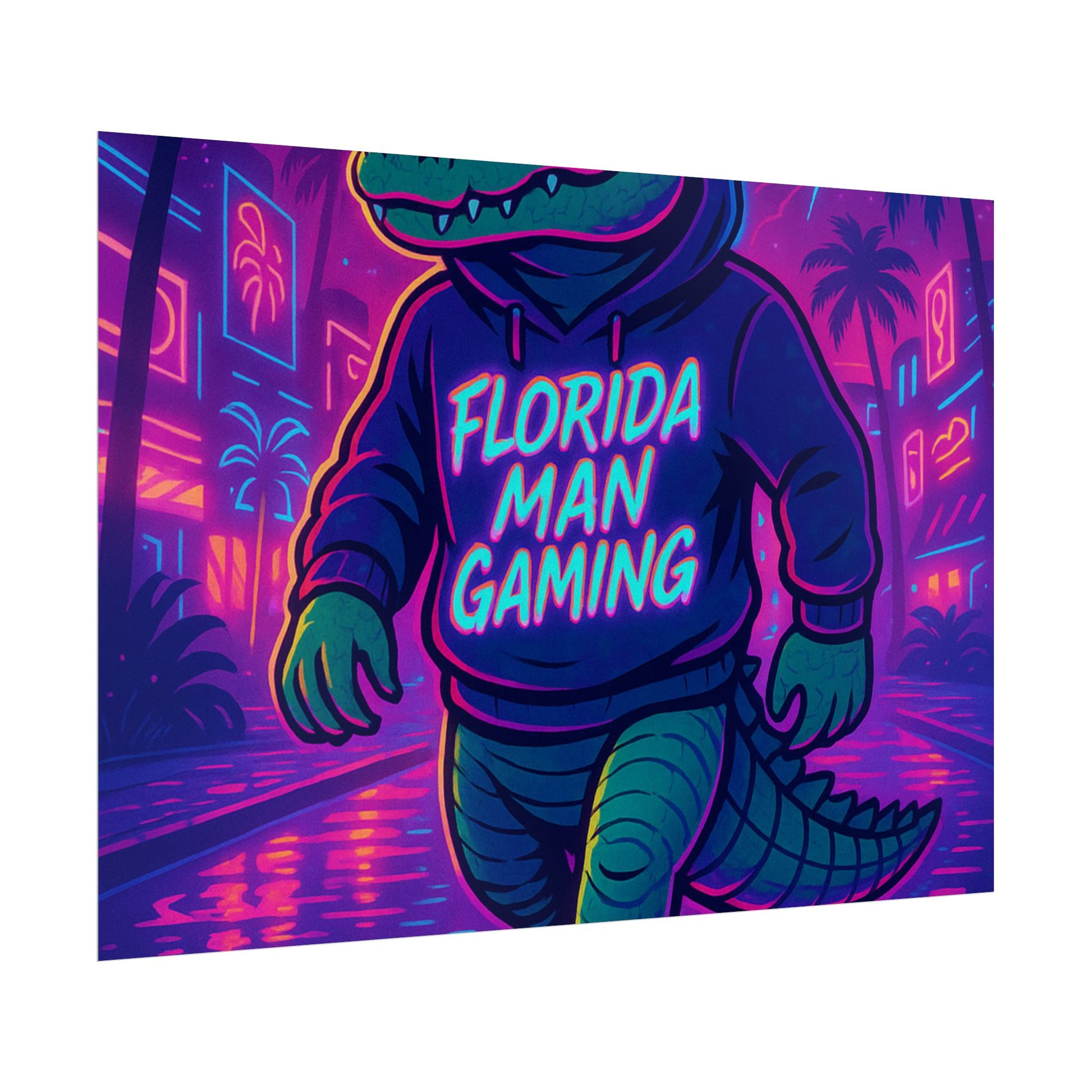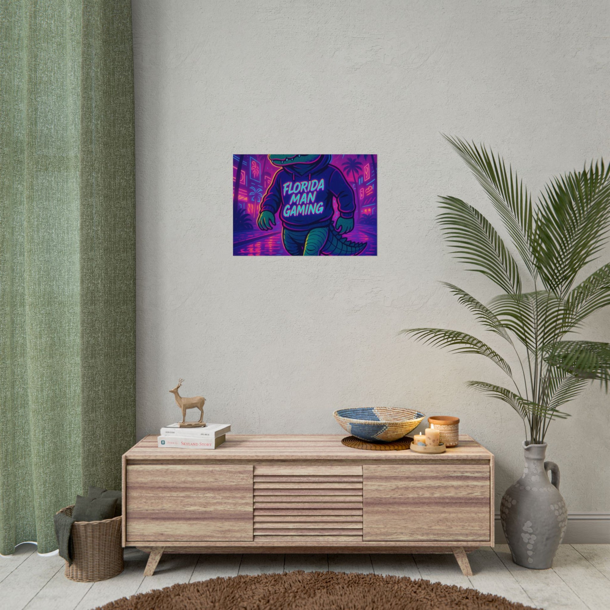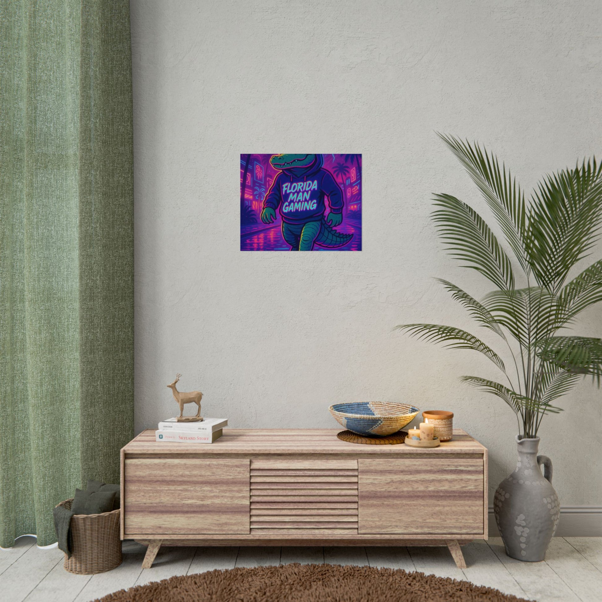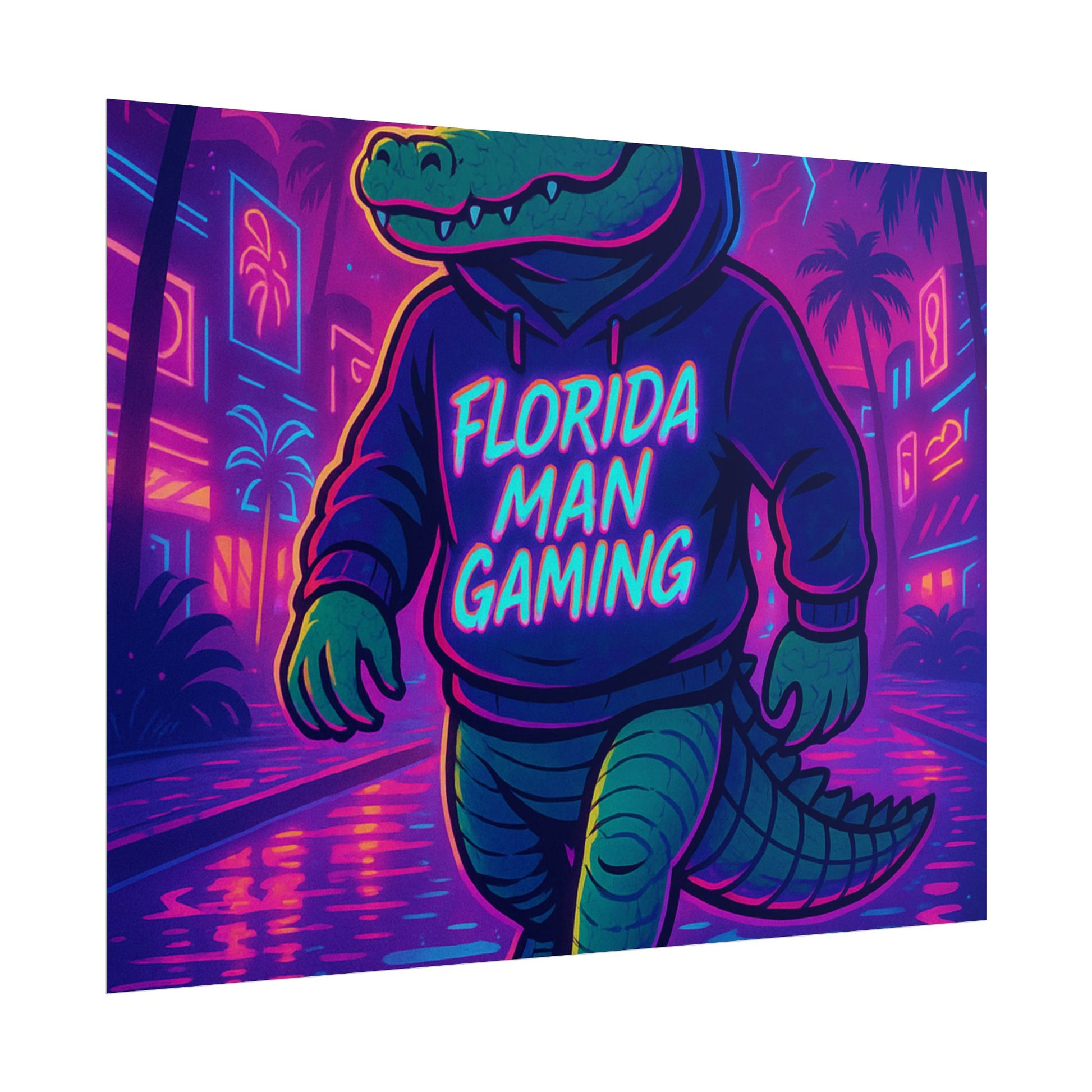 Step into a vibrant 80s dream with this retro vaporwave neon poster featuring the Florida Man Gaming gator mascot strutting down a rainy street at night. Perfect for gamers and fans of Florida culture, this poster is a colorful addition to any space. Celebrate gaming and Florida vibes with this electric and chaotic design.