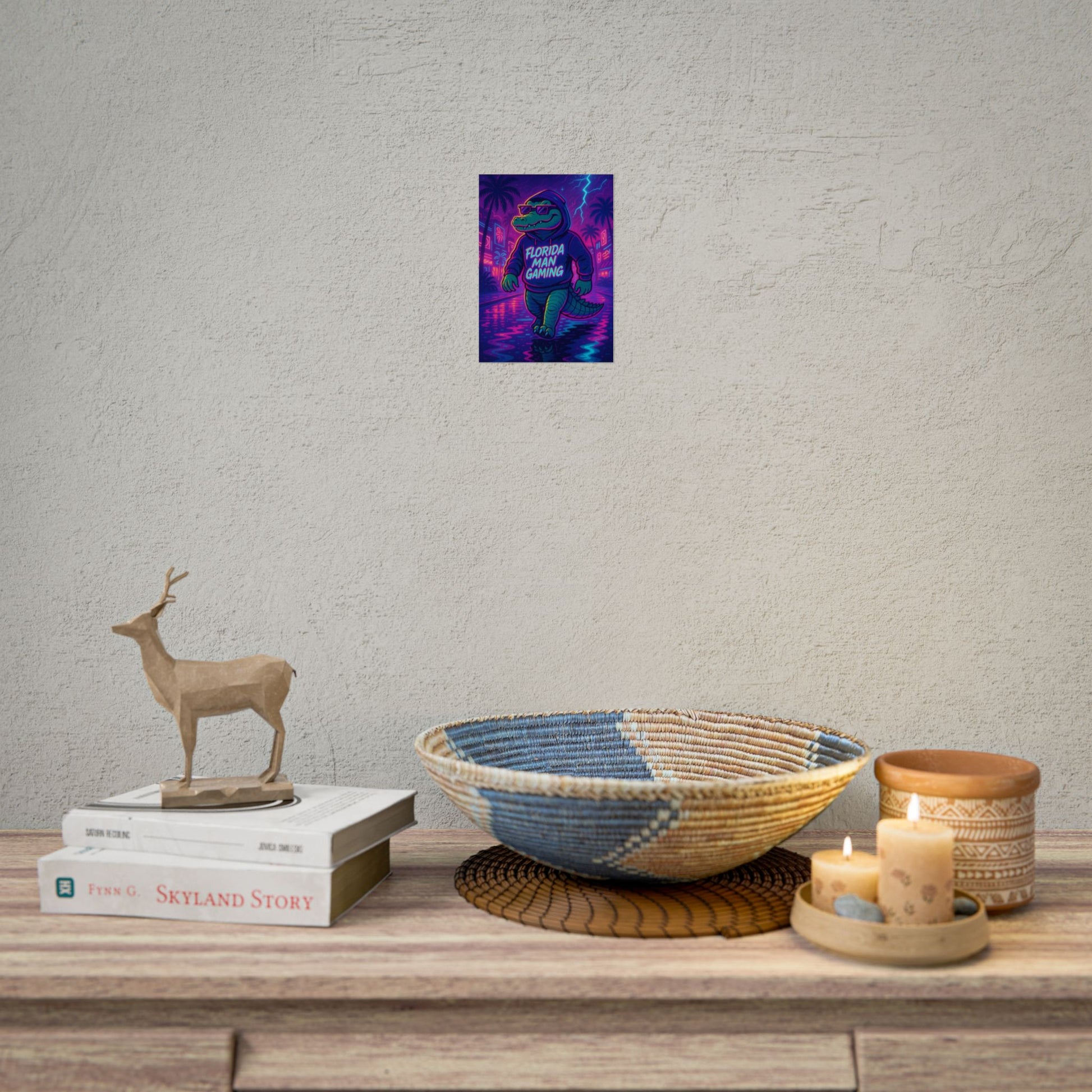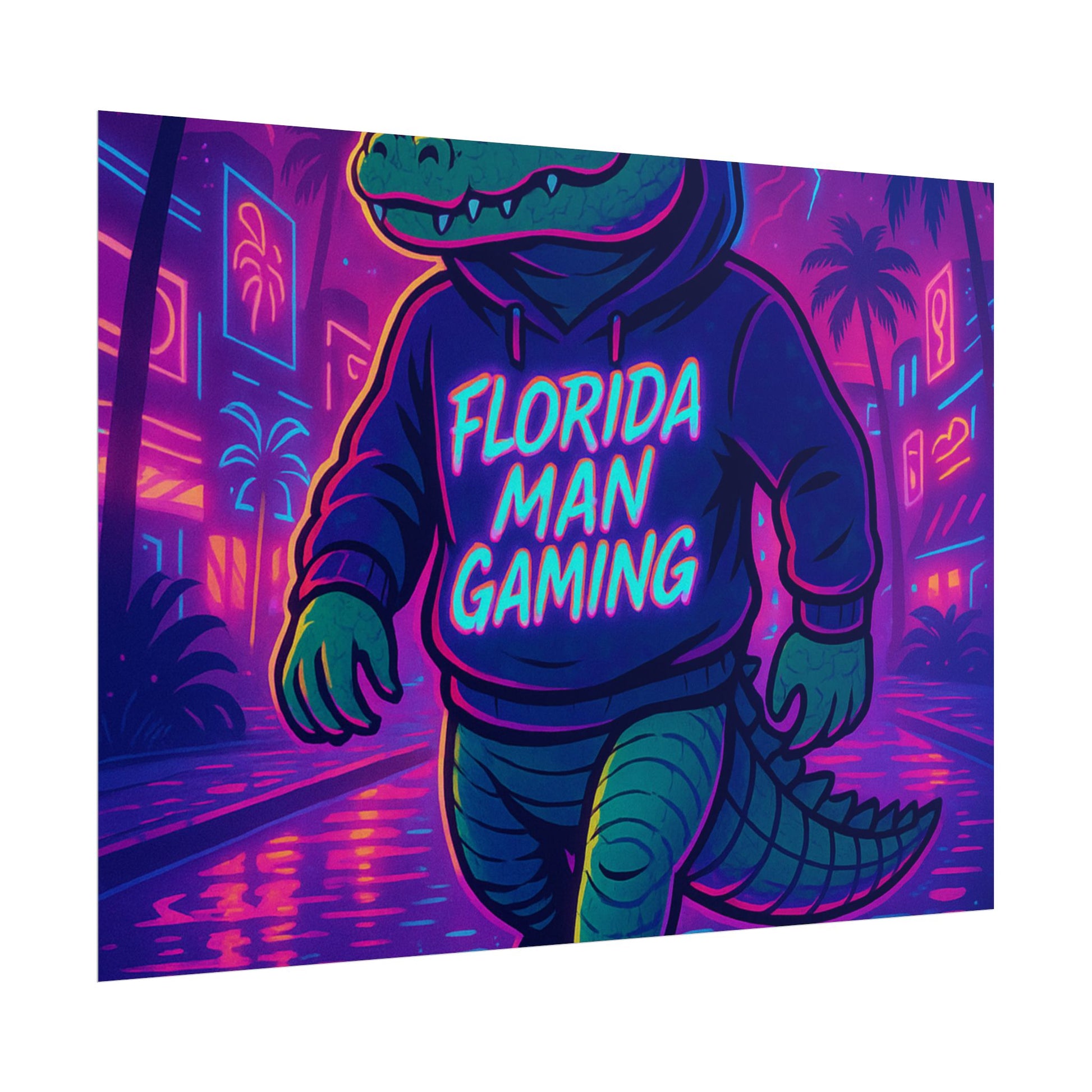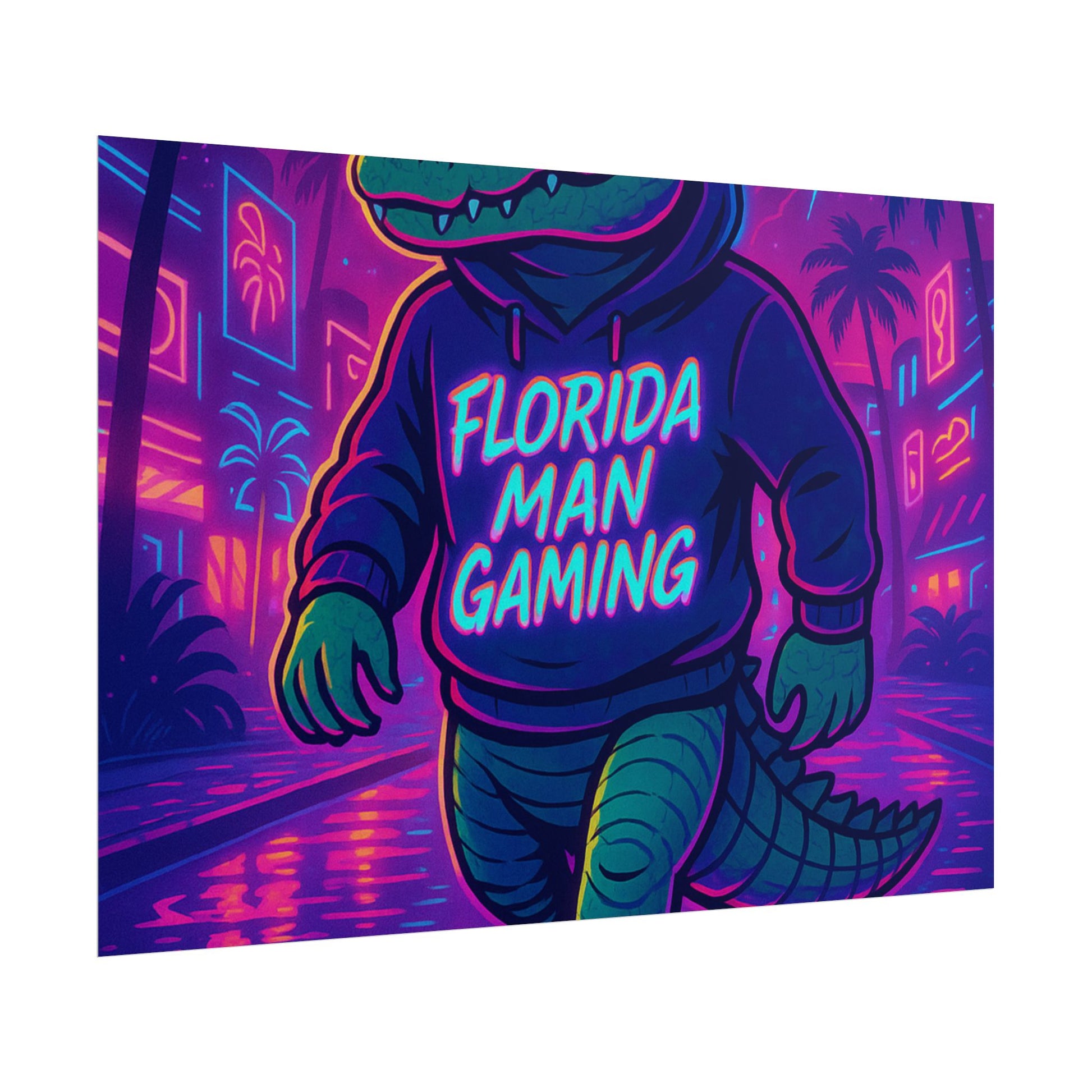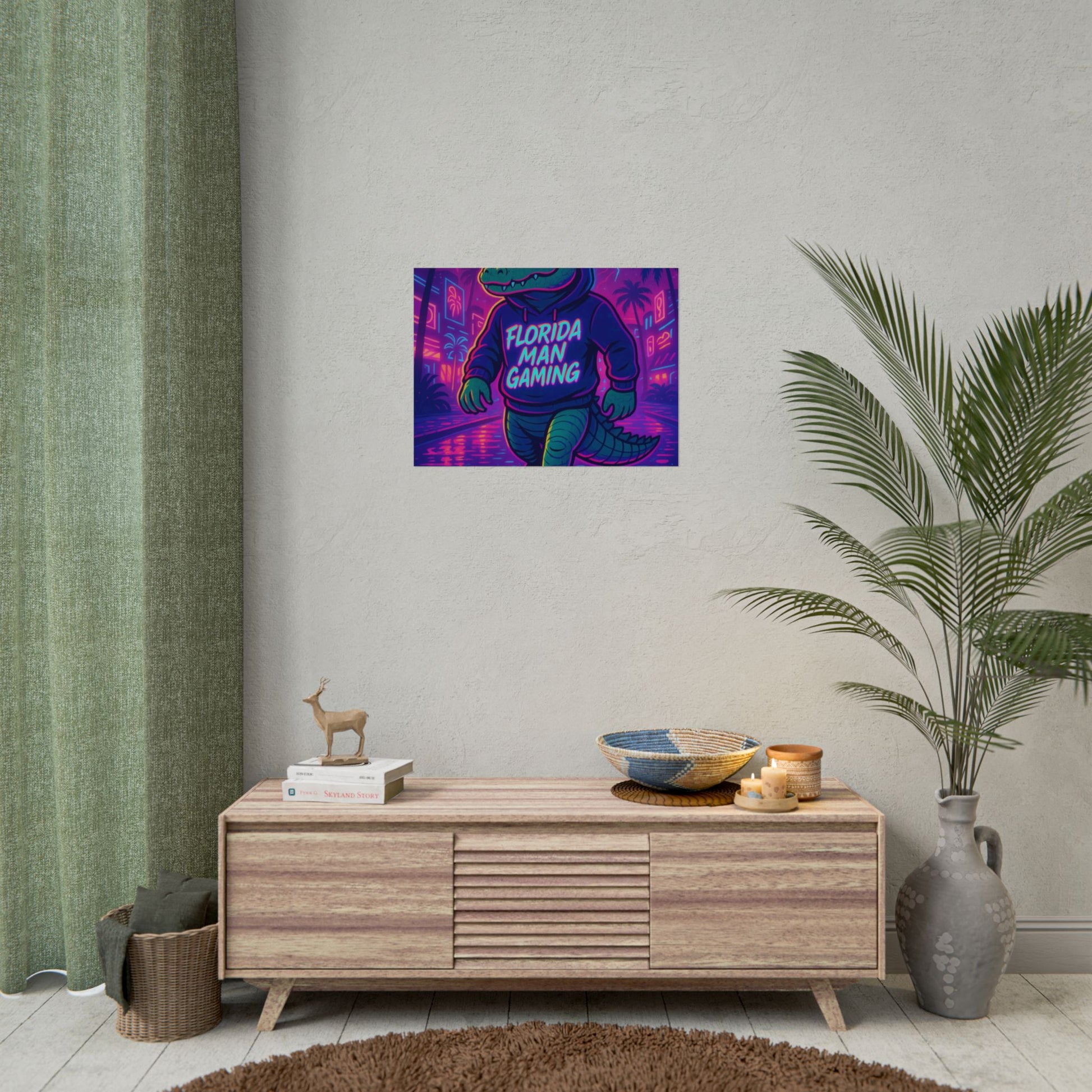 Step into a vibrant 80s dream with this retro vaporwave neon poster featuring the Florida Man Gaming gator mascot strutting down a rainy street at night. Perfect for gamers and fans of Florida culture, this poster is a colorful addition to any space. Celebrate gaming and Florida vibes with this electric and chaotic design.