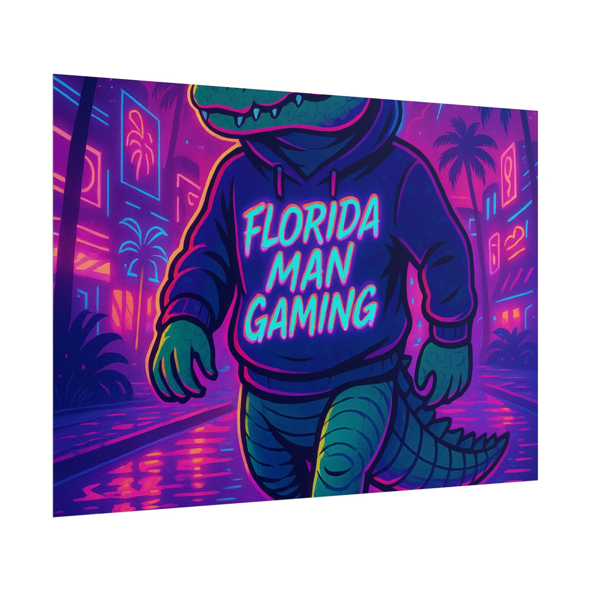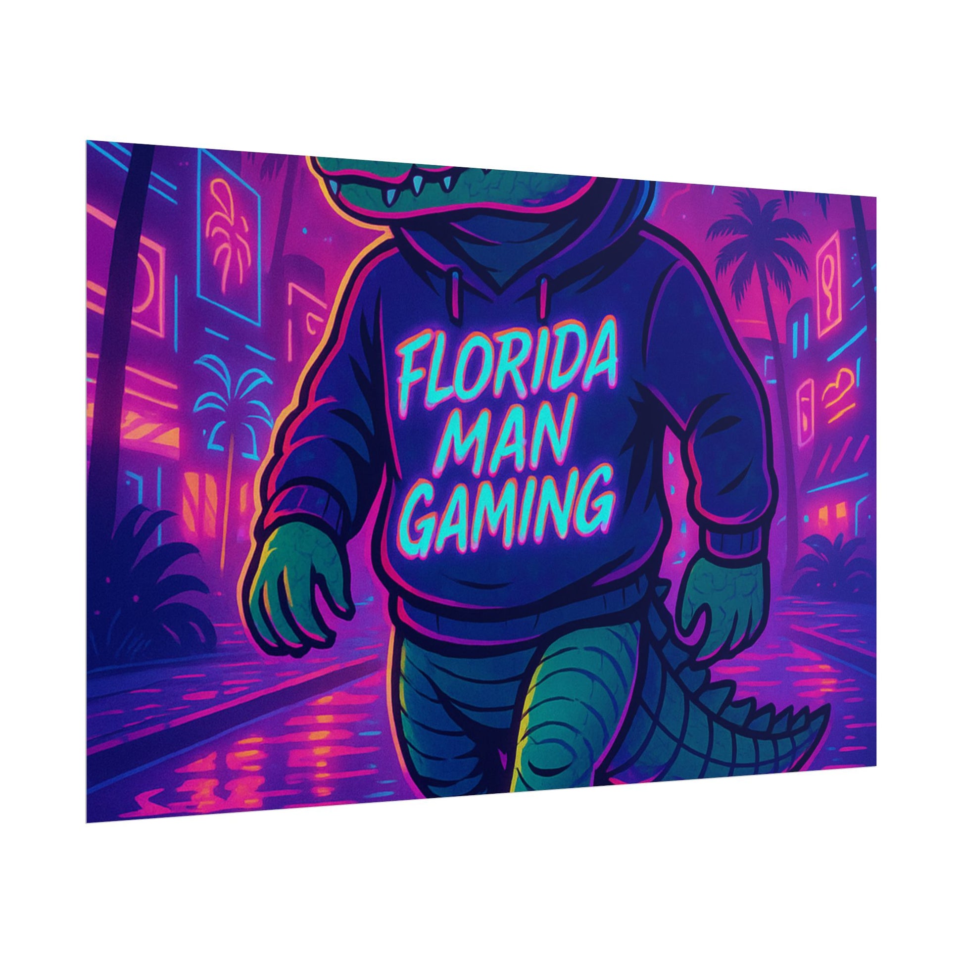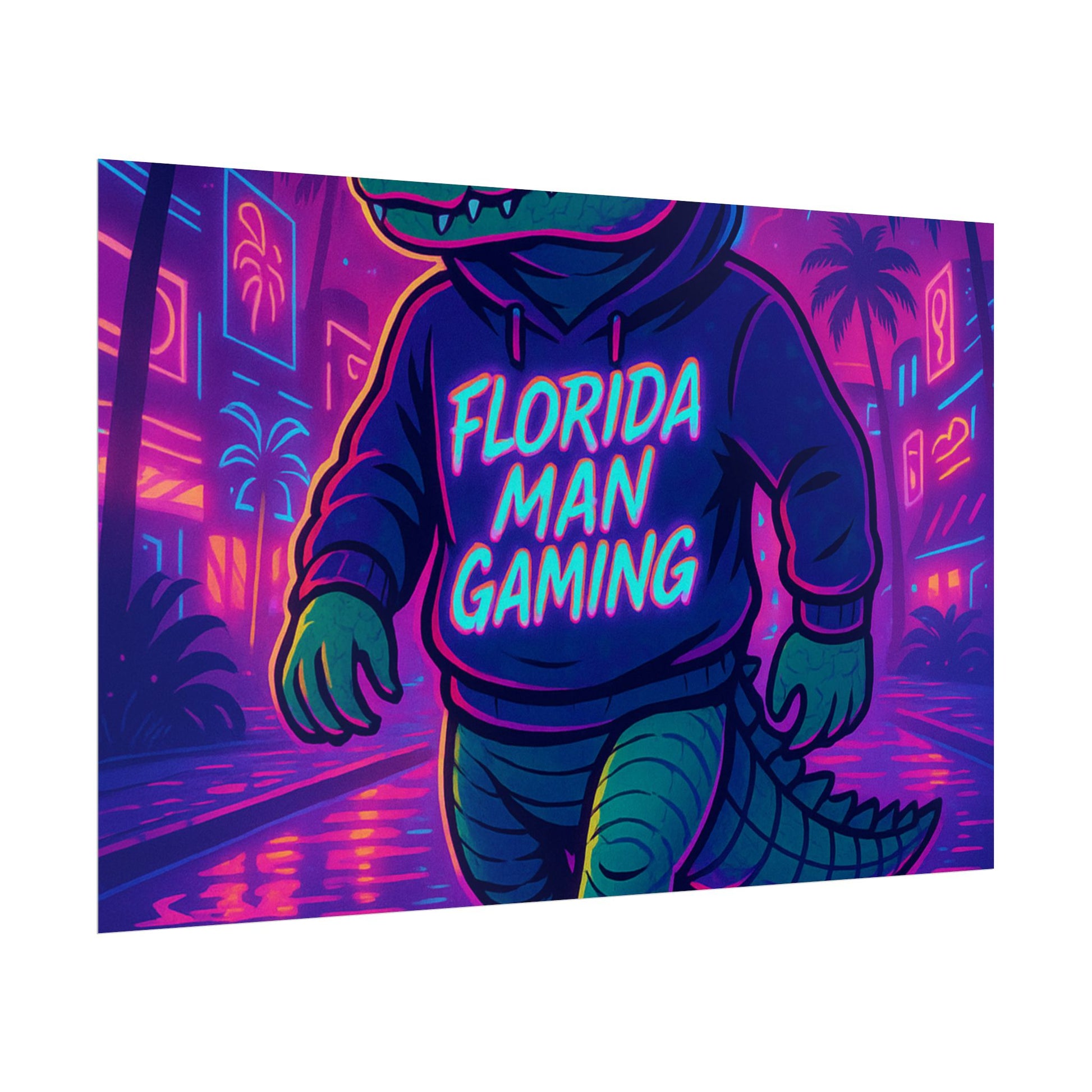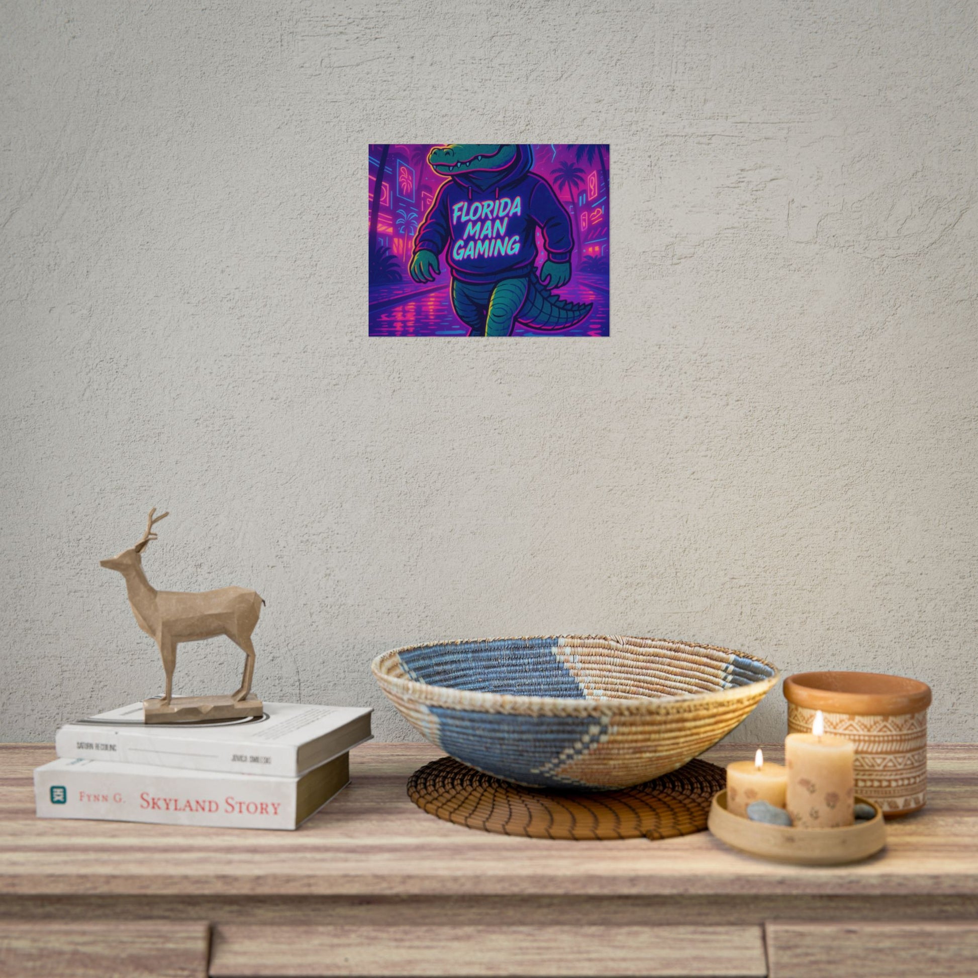 Step into a vibrant 80s dream with this retro vaporwave neon poster featuring the Florida Man Gaming gator mascot strutting down a rainy street at night. Perfect for gamers and fans of Florida culture, this poster is a colorful addition to any space. Celebrate gaming and Florida vibes with this electric and chaotic design.