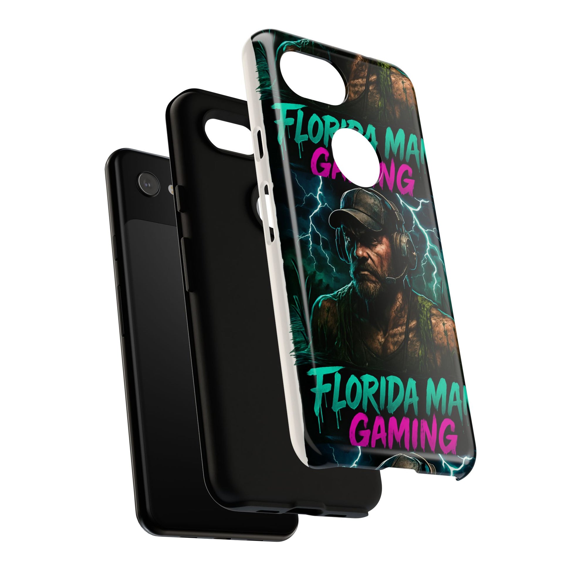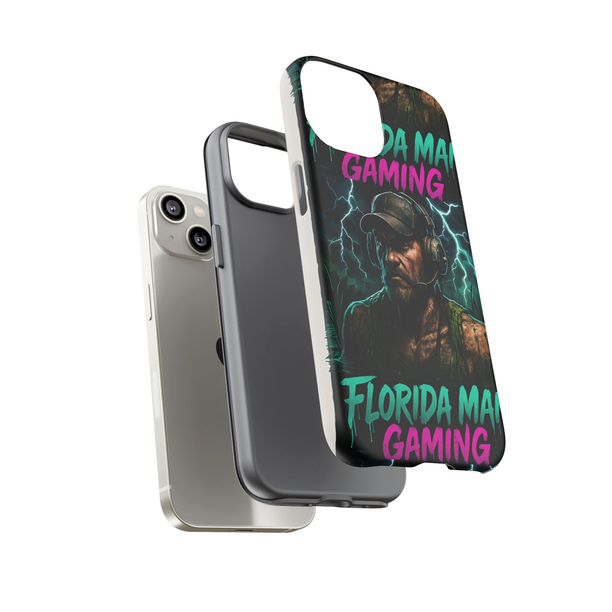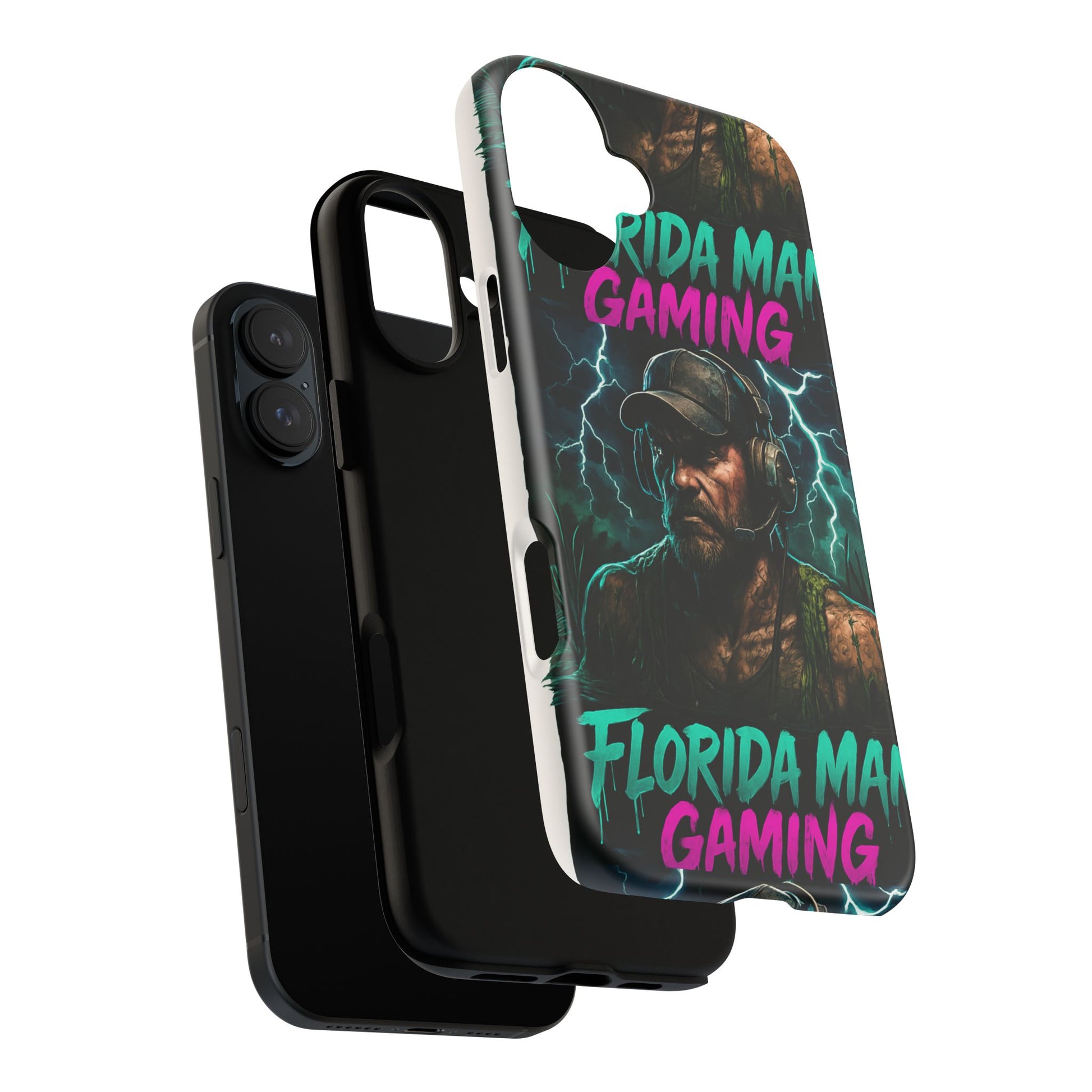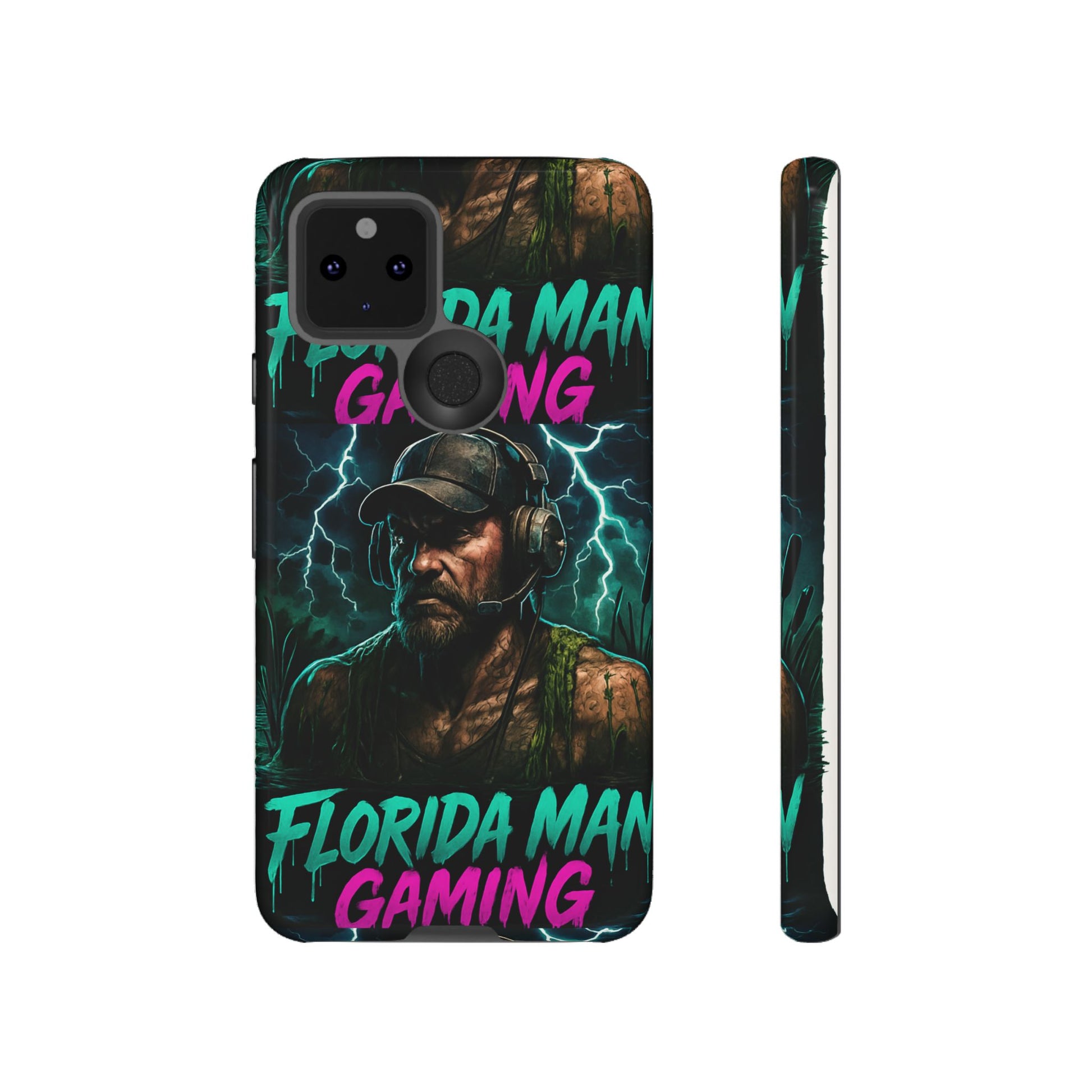 This tough phone case features a Florida Man Gaming mascot rising from the swamp with lightning in the background, surrounded by neon letters. It exudes a cool and edgy vibe, perfect for gamers and tech enthusiasts. Ideal for those who love gaming and want to protect their phone in style. Great for birthdays, holidays, and everyday use.