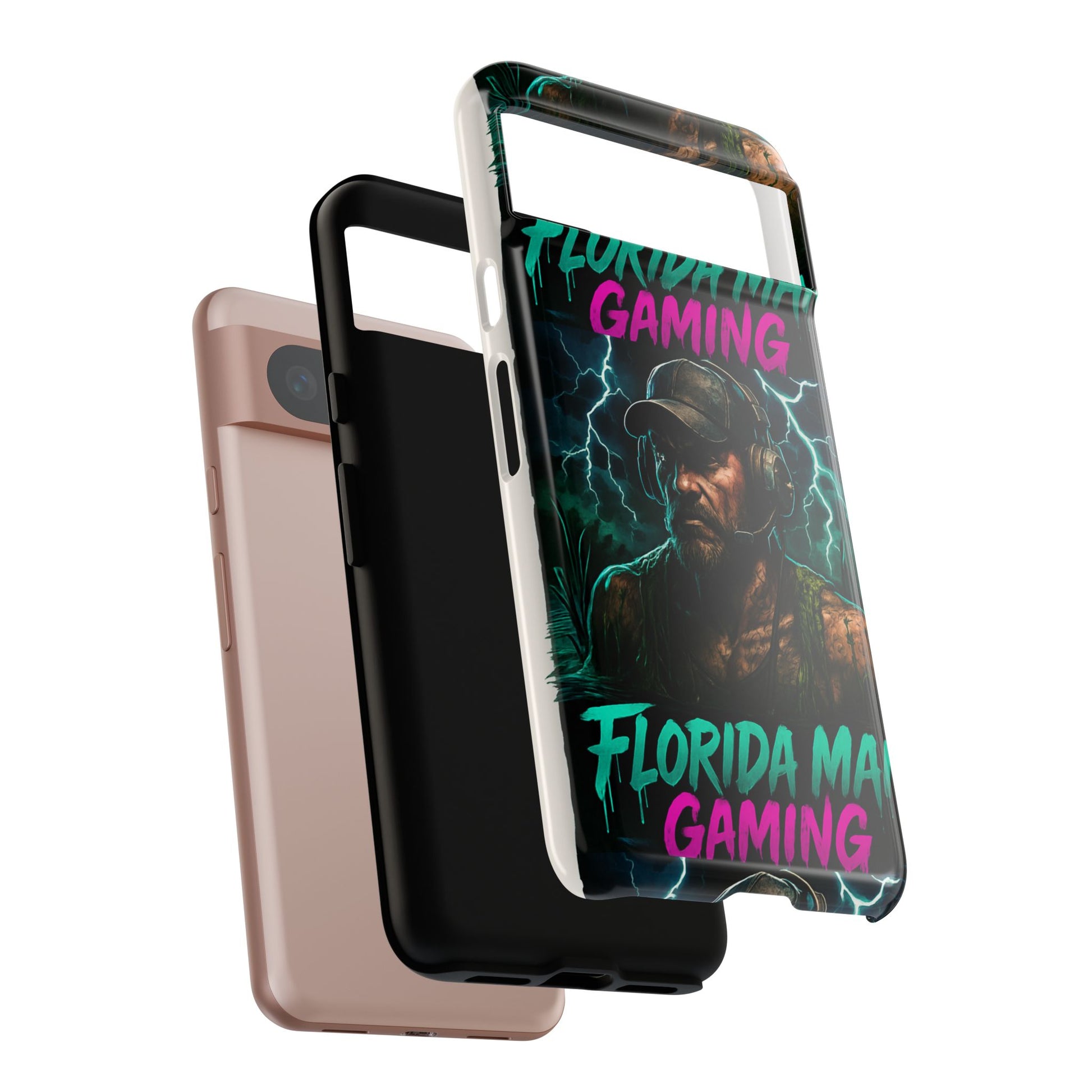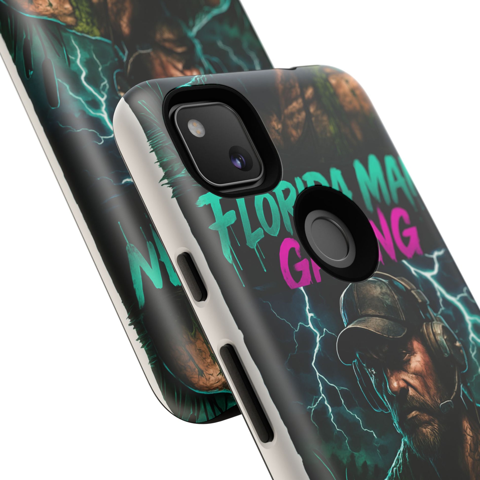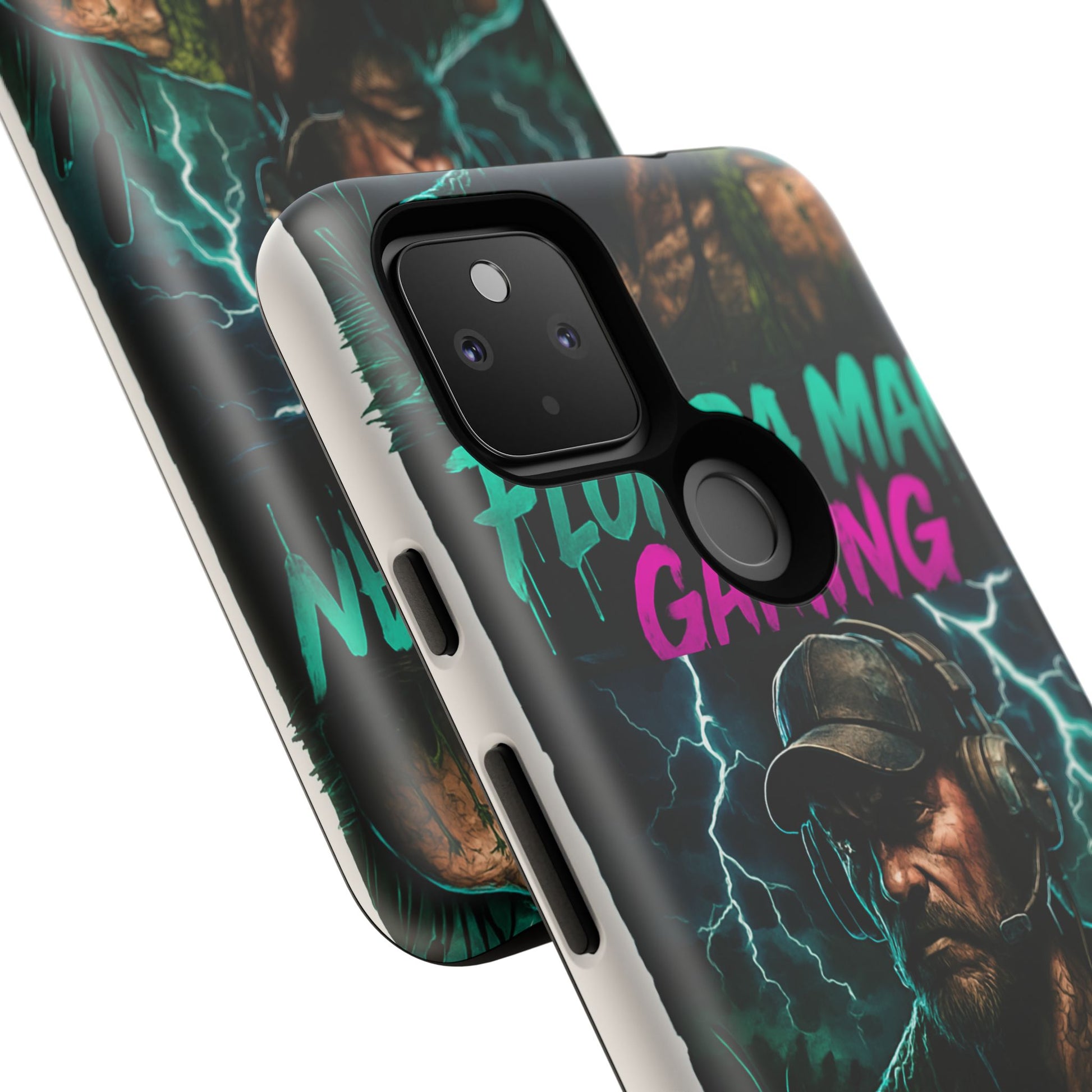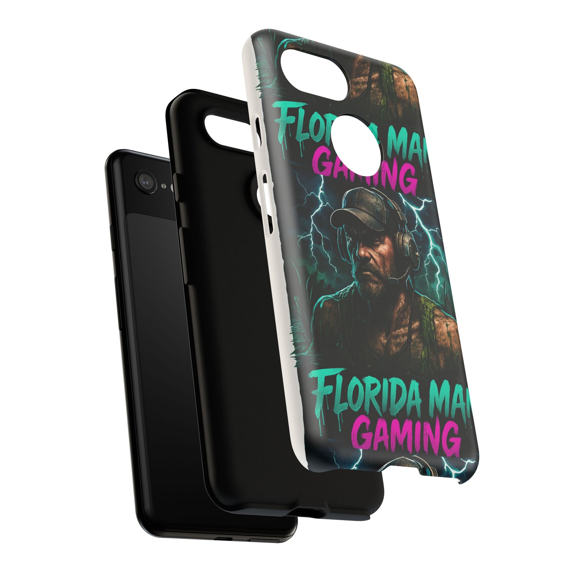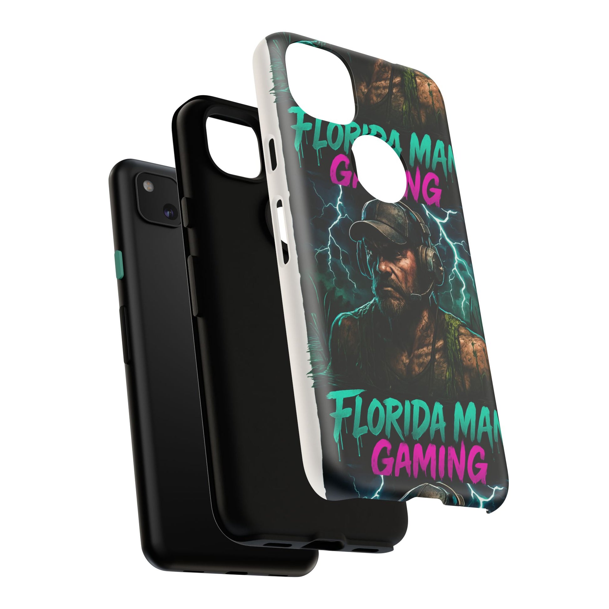 This tough phone case features a Florida Man Gaming mascot rising from the swamp with lightning in the background, surrounded by neon letters. It exudes a cool and edgy vibe, perfect for gamers and tech enthusiasts. Ideal for those who love gaming and want to protect their phone in style. Great for birthdays, holidays, and everyday use.