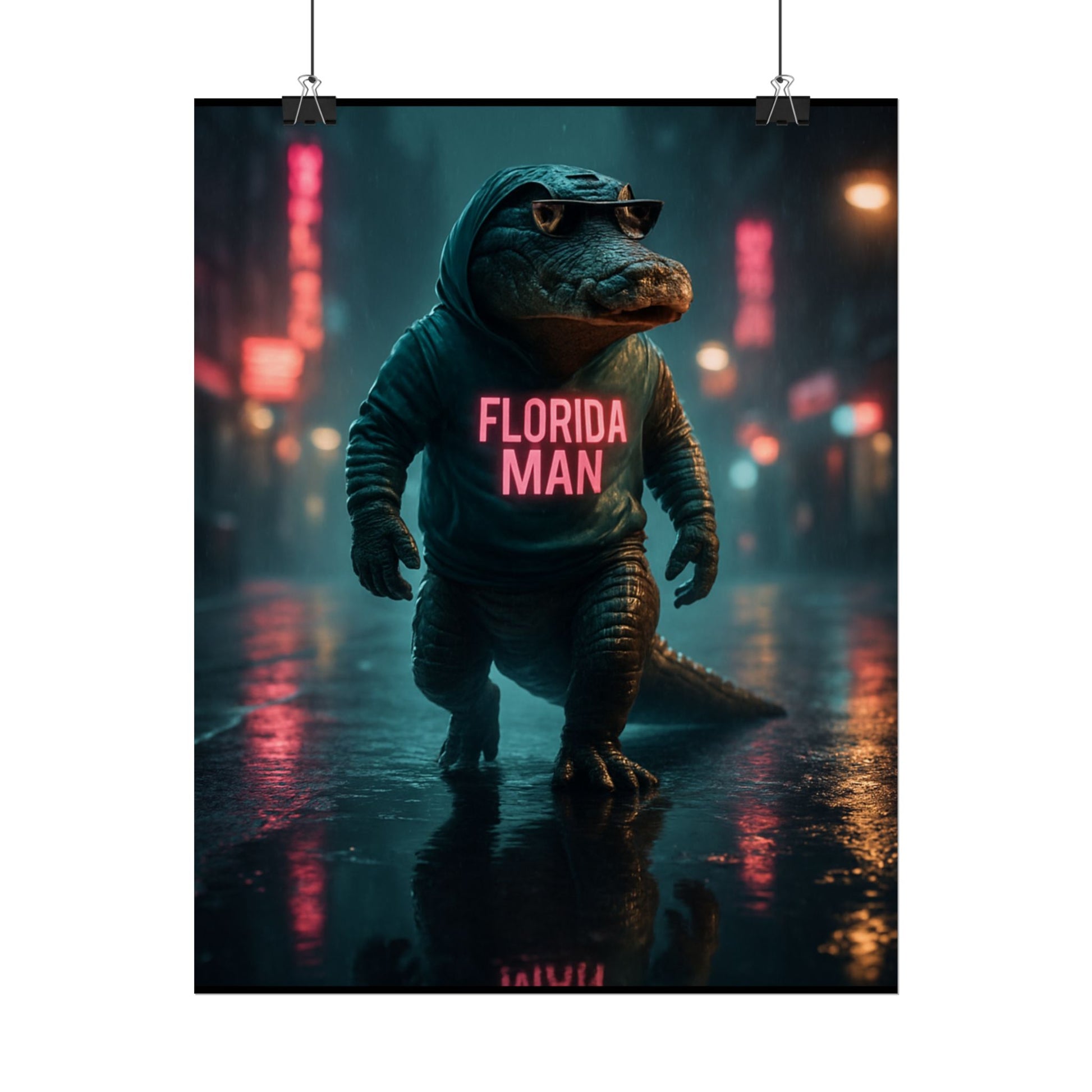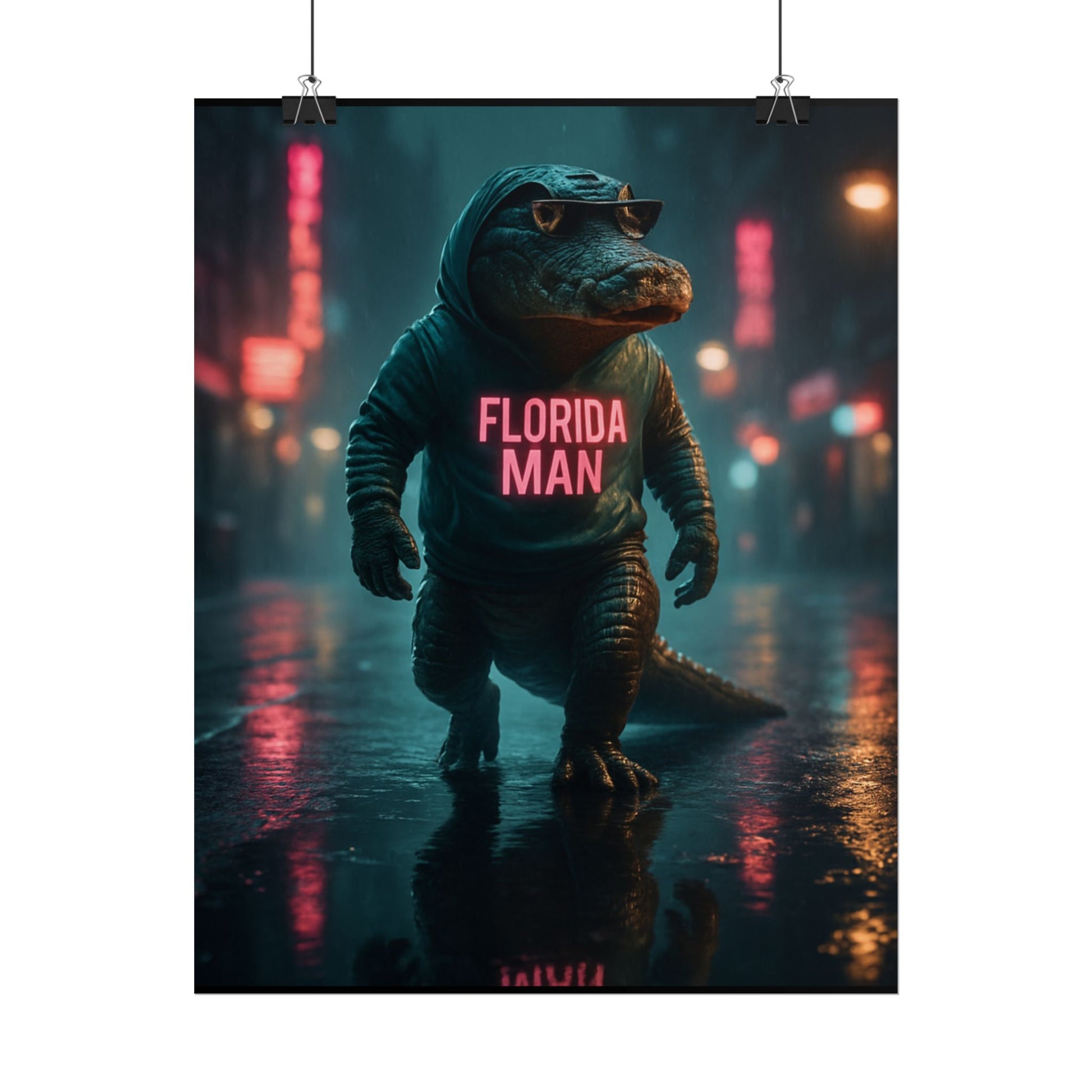 Immerse yourself in the Florida cyberpunk atmosphere with this cinematic ultra-realistic 3D render of the Florida Man Gaming alligator mascot walking down a rainy city street at night. The gator wears pixel sunglasses and a neon hoodie, with rain pouring gently while reflections of magenta, teal, and golden streetlights shimmer in puddles. This high-resolution 8K poster gives a moody, movie-like feel that appeals to art lovers and cyberpunk enthusiasts. Perfect for decorating your space with a touch of dramatic realism.