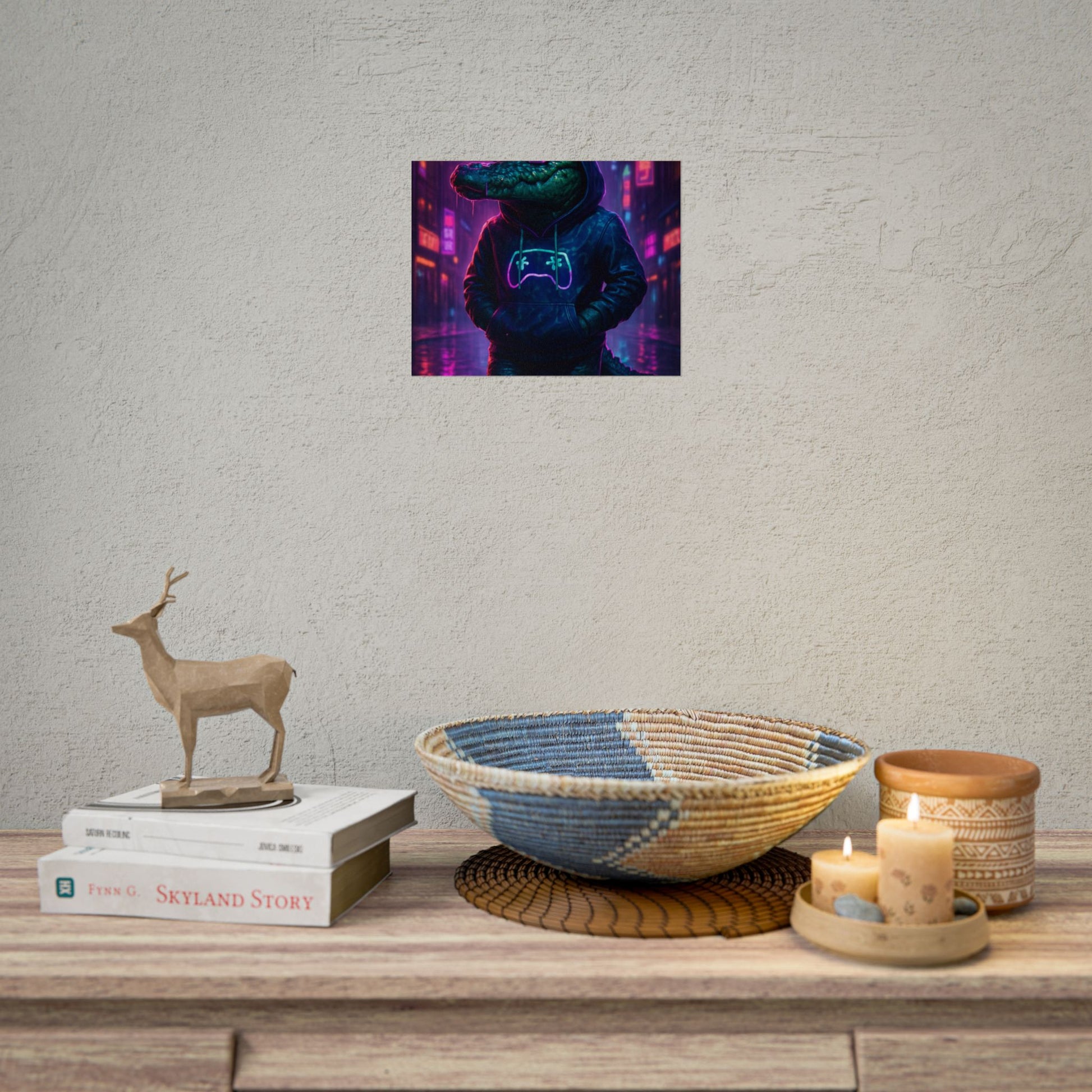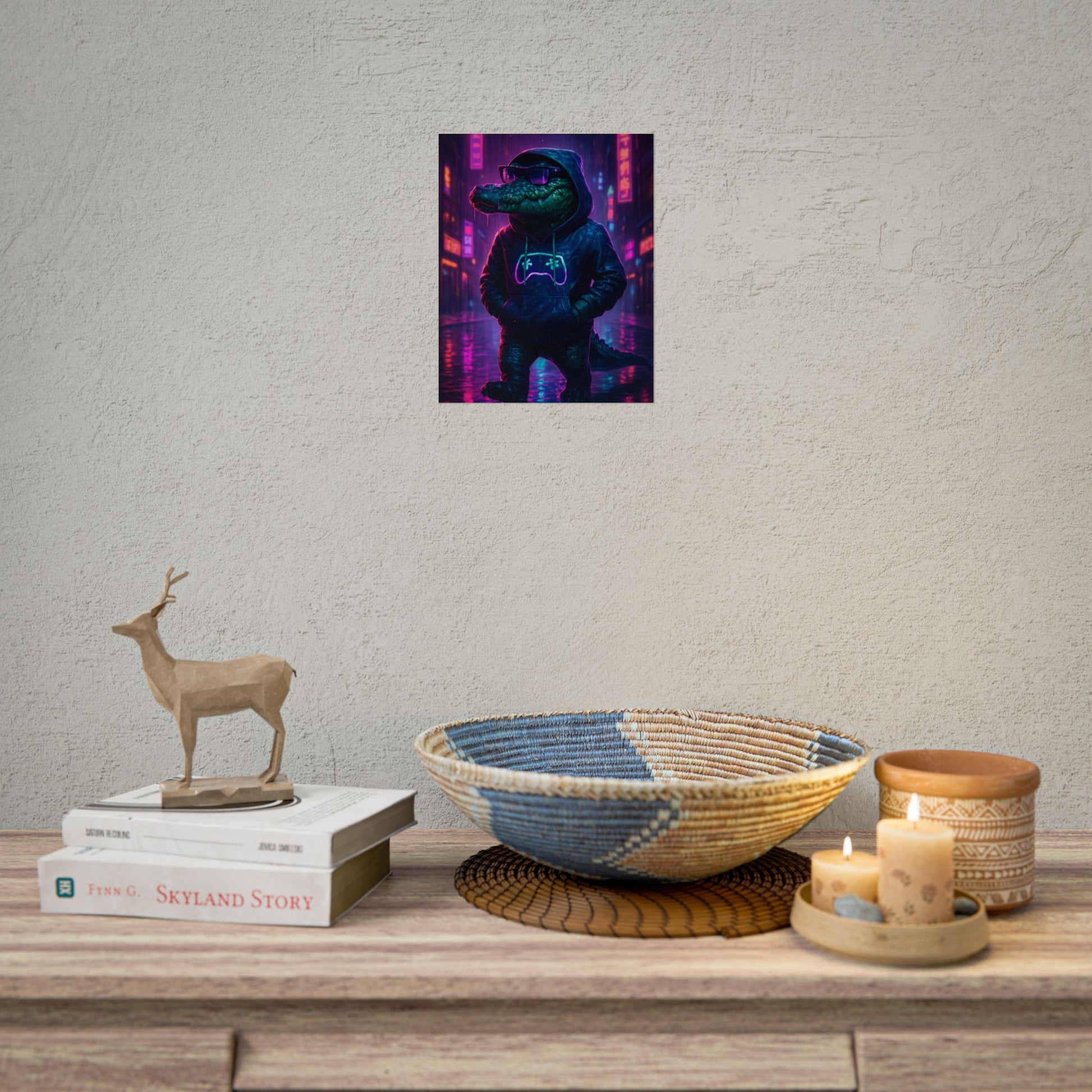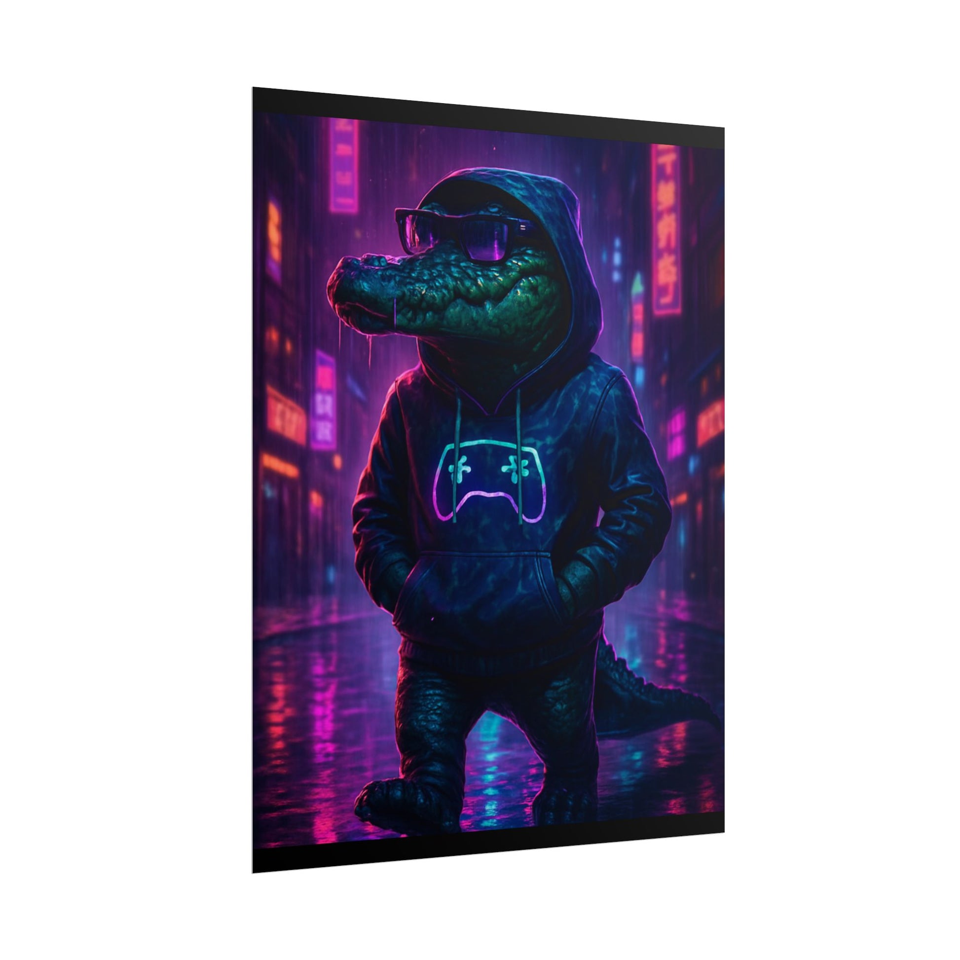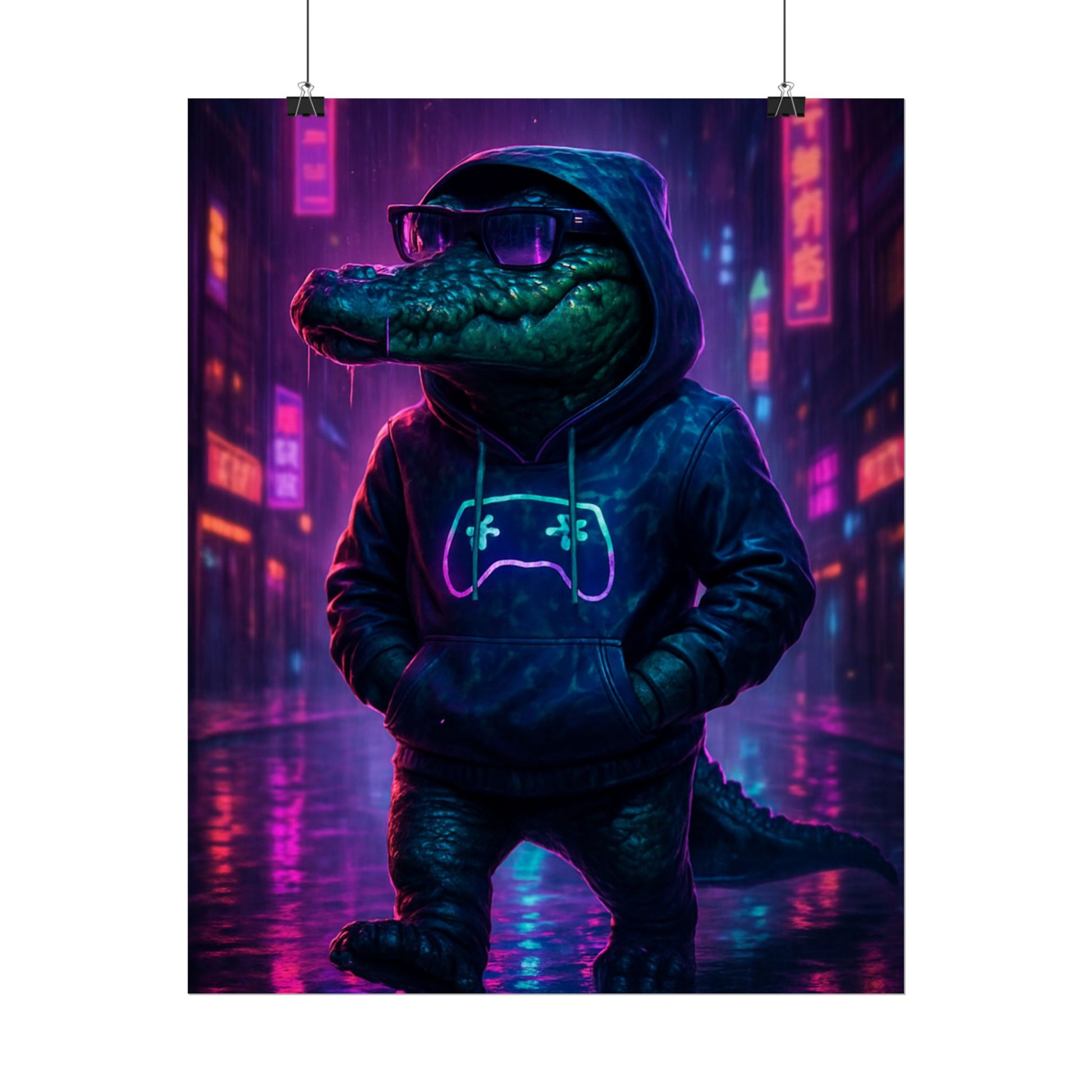 Vivid and moody cinematic scene of a cool, mischievous gator wearing pixel sunglasses and a neon gamer hoodie walking down a rainy city street at night. The atmosphere feels electric with purple, teal, and magenta hues. Perfect for fans of Florida cyberpunk aesthetic. Ideal for adding a unique touch to a room decor, especially for gamers and fans of vaporwave art. Great for gifting on birthdays, holidays, or to anyone who loves quirky and eye-catching art pieces.