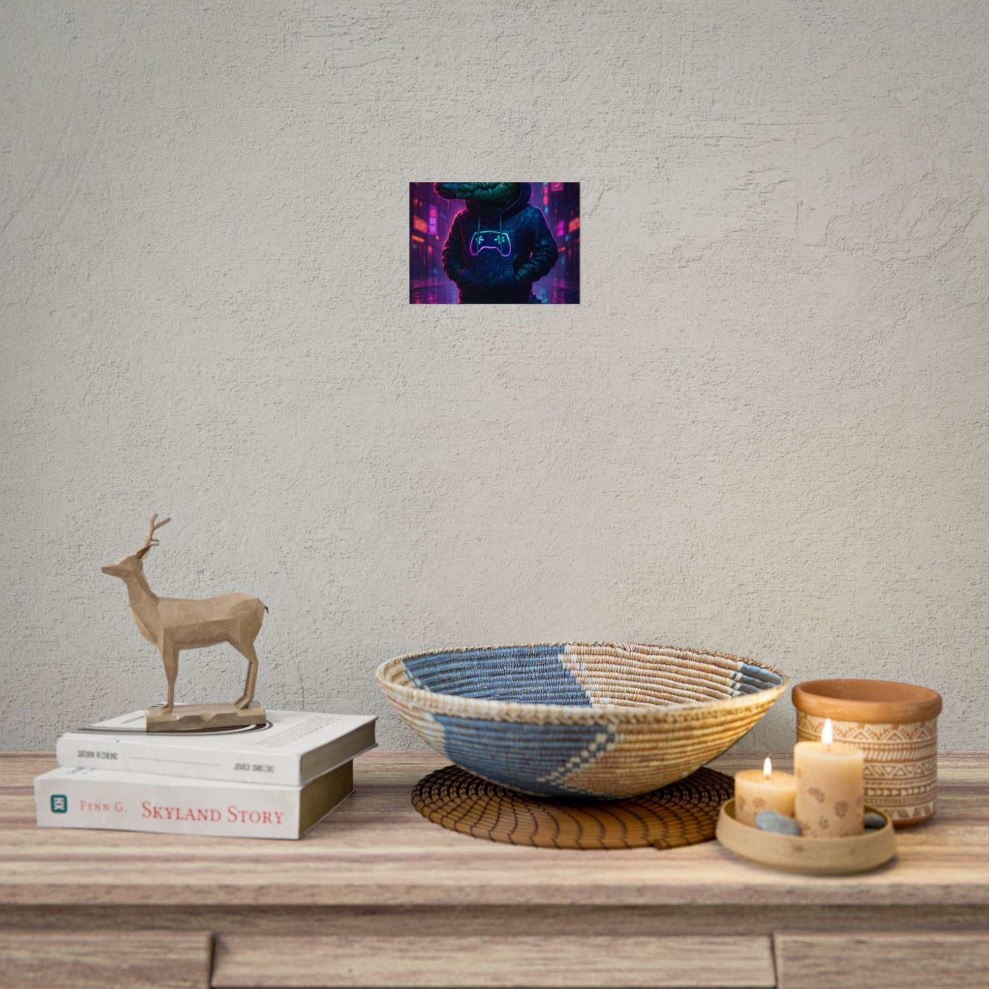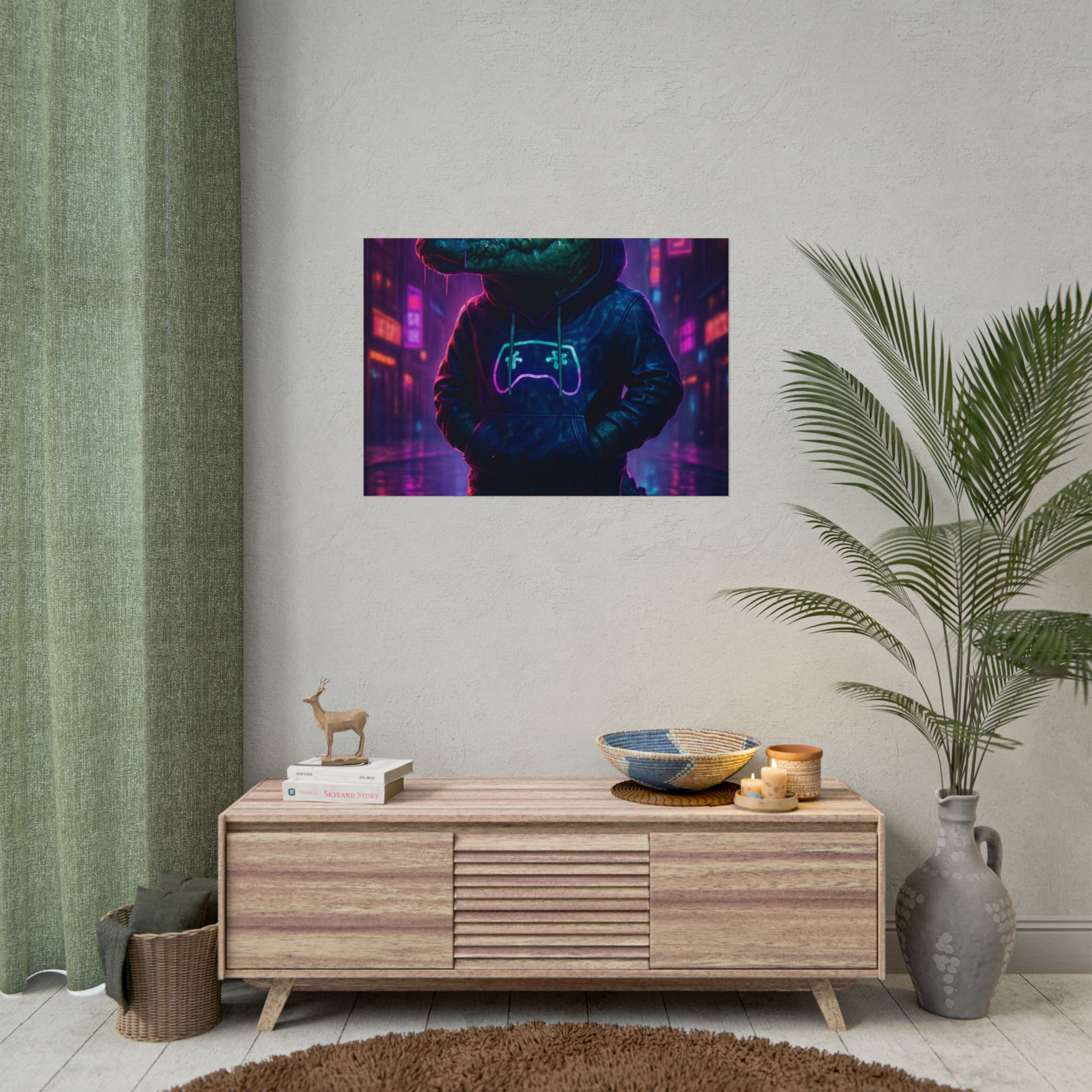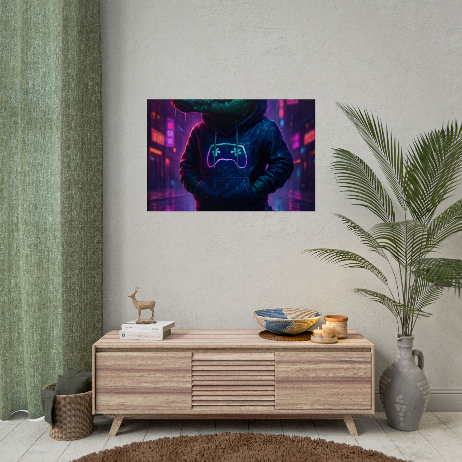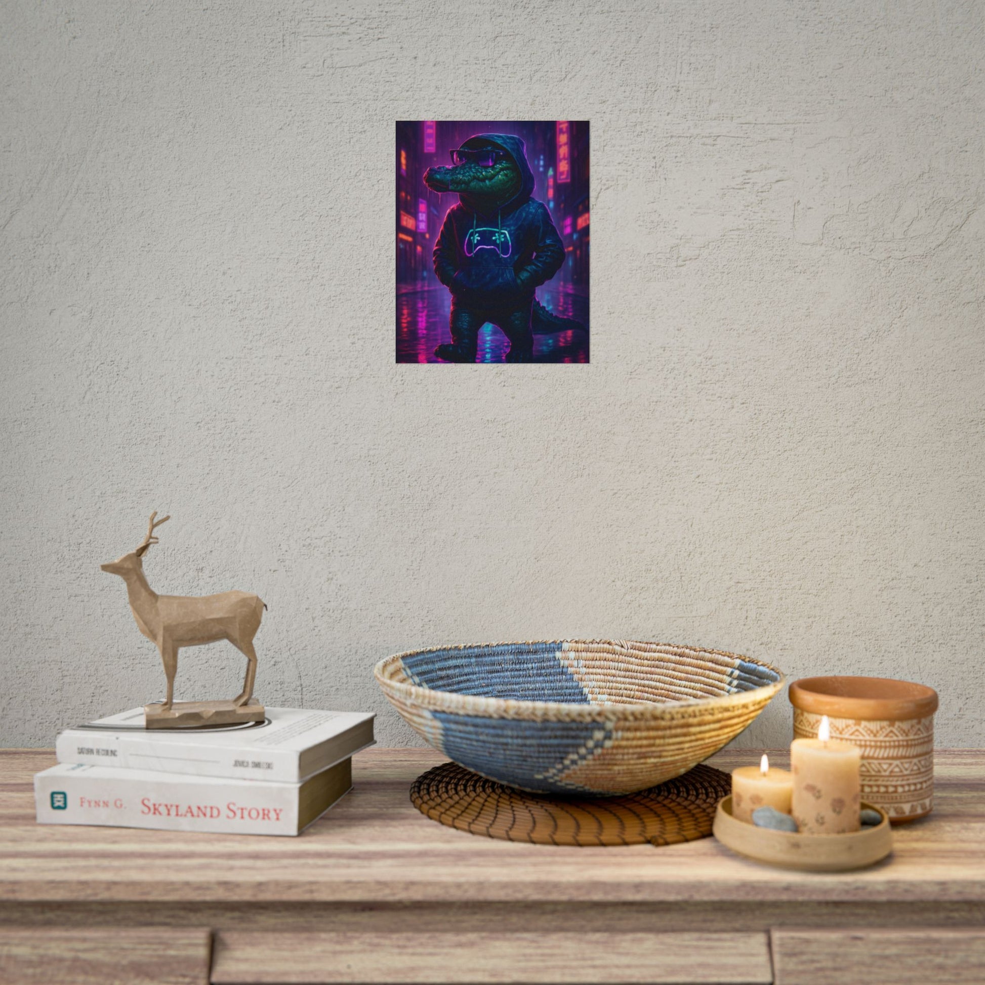 Vivid and moody cinematic scene of a cool, mischievous gator wearing pixel sunglasses and a neon gamer hoodie walking down a rainy city street at night. The atmosphere feels electric with purple, teal, and magenta hues. Perfect for fans of Florida cyberpunk aesthetic. Ideal for adding a unique touch to a room decor, especially for gamers and fans of vaporwave art. Great for gifting on birthdays, holidays, or to anyone who loves quirky and eye-catching art pieces.